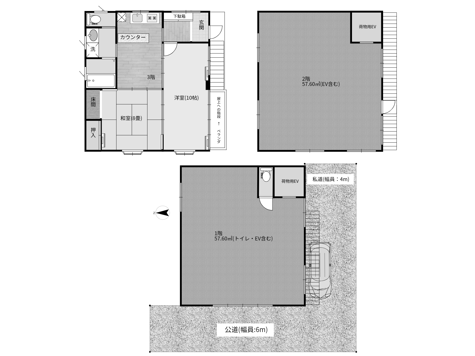 床面積1階~3階 各57.60㎡ 延床 172.80㎡(52.27坪)